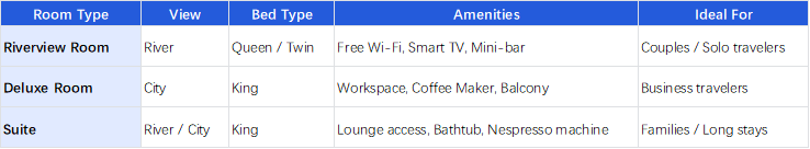 • The Best Brew™: The hotel’s laid-back bar, perfect for winding down with craft beers and light bites while taking in the riverside atmosphere.